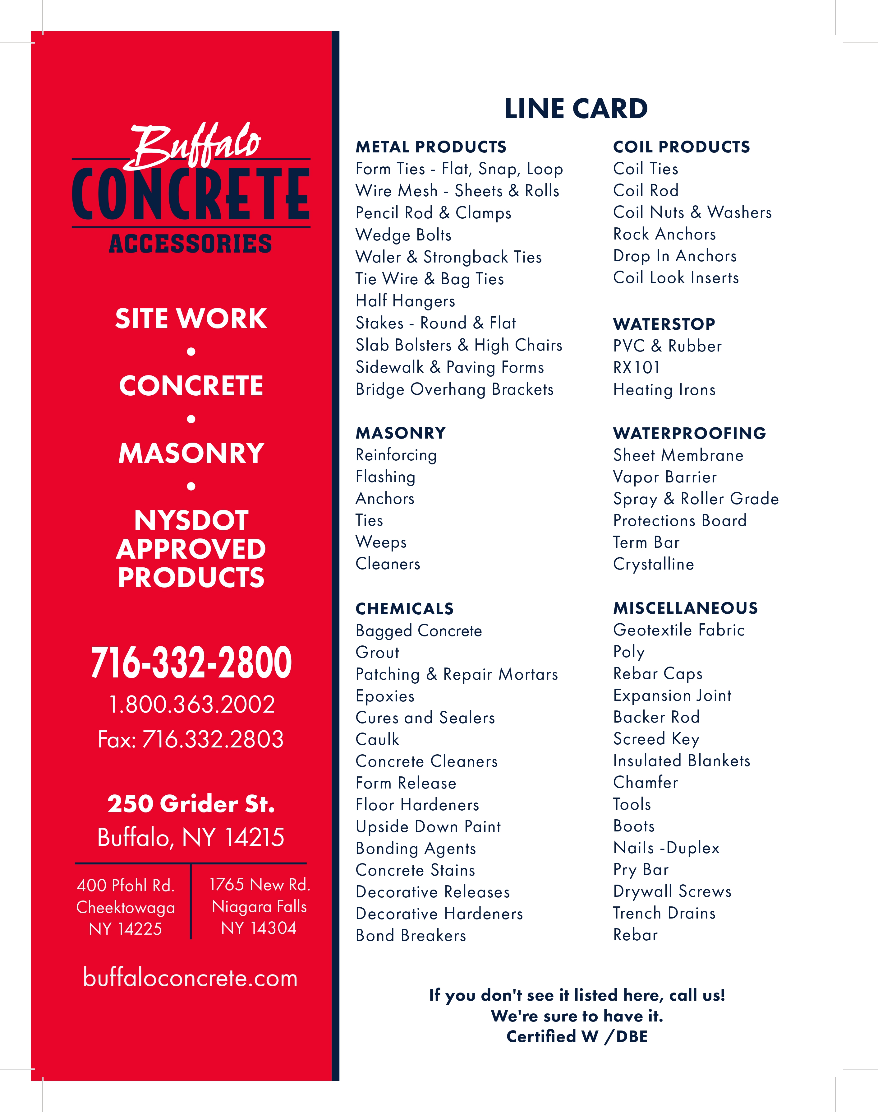 Servicing Niagara and Erie Counties, Preferred Materials works in conjunction with Buffalo Concrete Accessories to offer a complete line of Builders Supply products including wire mesh, expansion joints, rebar, aggregates, sealers, releases, a complete line of masonry bagged goods and repair products, professional grade caulking and epoxies, as well as assorted tools and construction type apparel. Click on our line card (pdf to the left) to get a comprehensive list of our product offerings.